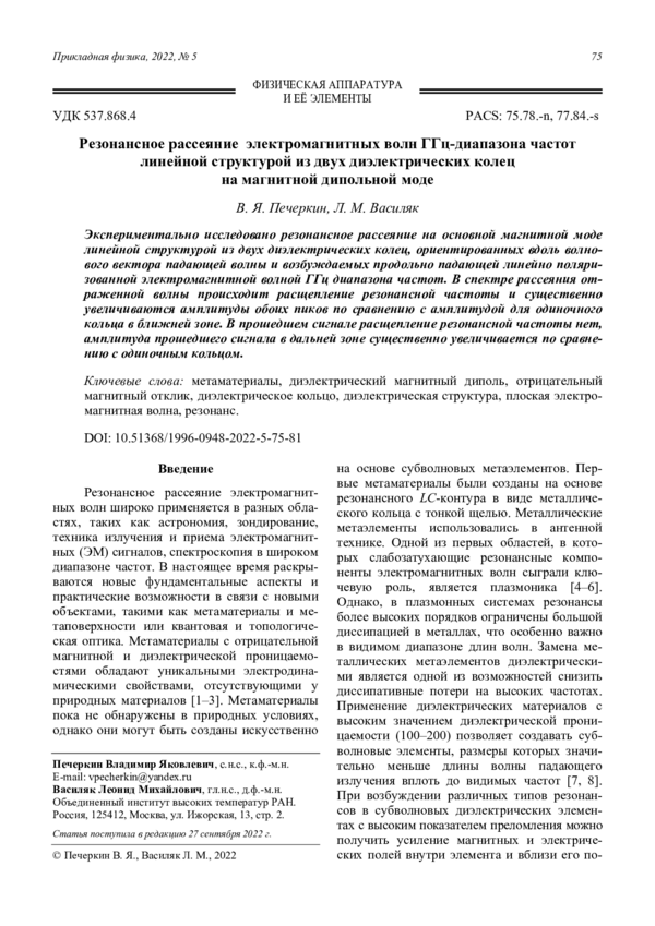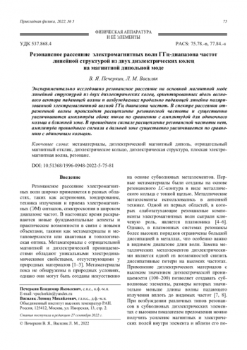 Резонансное рассеяние электромагнитных волн ГГц-диапазона частот линейной структурой из двух диэлектрических колец на магнитной дипольной моде 75