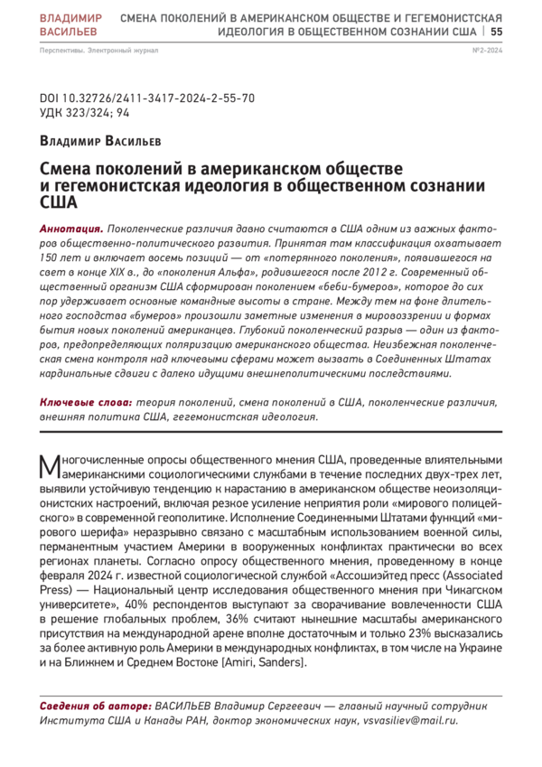 Поколенческие различия давно считаются в США одним из важных факторов общественно-политического развития. Принятая там классификация охватывает 150 лет и включает восемь позиций - от «потерянного поколения», появившегося на свет в конце XIX в., до «поколения Альфа», родившегося после 2012 г. Современный общественный организм США сформирован поколением «беби-бумеров», которое до сих пор удерживает основные командные высоты в стране. Между тем на фоне длительного господства «бумеров» произошли заметные изменения в мировоззрении и формах бытия новых поколений американцев. Глубокий поколенческий разрыв - один из факторов, предопределяющих поляризацию американского общества. Неизбежная поколенческая смена контроля над ключевыми сферами может вызвать в Соединенных Штатах кардинальные сдвиги с далеко идущими внешнеполитическими последствиями.