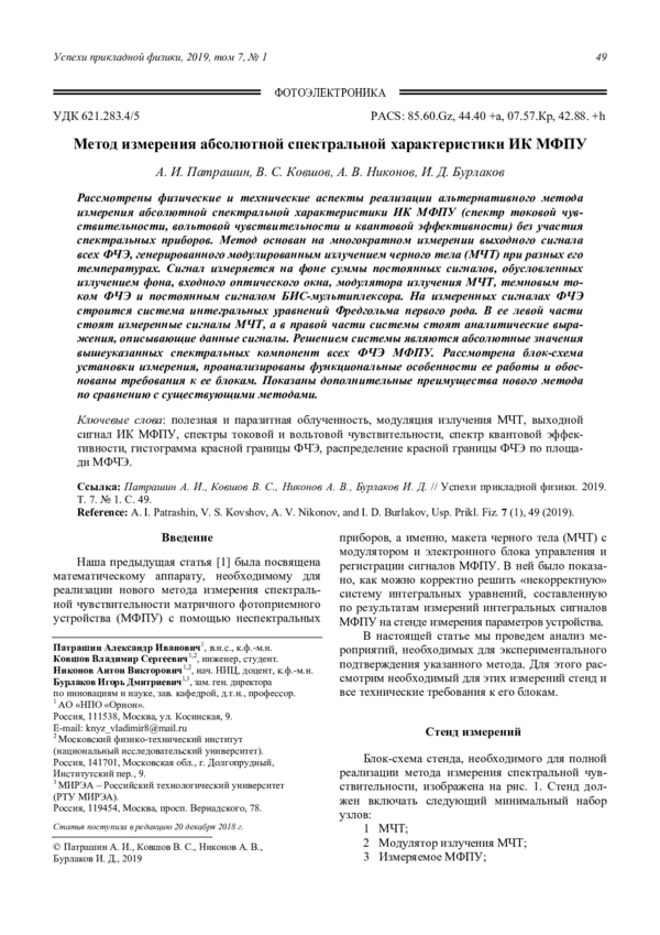 Рассмотрены физические и технические аспекты реализации альтернативного метода измерения абсолютной спектральной характеристики ИК МФПУ (спектр токовой чувствительности, вольтовой чувствительности и квантовой эффективности) без участия спектральных приборов. Метод основан на многократном измерении выходного сигнала всех ФЧЭ, генерированного модулированным излучением черного тела (МЧТ) при разных его температурах. Cигнал измеряется на фоне суммы постоянных сигналов, обусловленных излучением фона, входного оптического окна, модулятора излучения МЧТ, темновым током ФЧЭ и постоянным сигналом БИС-мультиплексора. На измеренных сигналах ФЧЭ строится система интегральных уравнений Фредгольма первого рода. В ее левой части стоят измеренные сигналы МЧТ, а в правой части системы стоят аналитические выражения, описывающие данные сигналы. Решением системы являются абсолютные значения вышеуказанных спектральных компонент всех ФЧЭ МФПУ. Рассмотрена блок-схема установки измерения, проанализированы функциональные особенности ее работы и обоснованы требования к ее блокам. Показаны дополнительные преимущества нового метода по сравнению с существующими методами.
