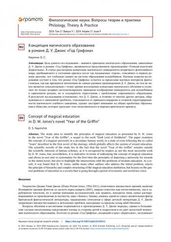 НАУМЧИК О. С. КОНЦЕПЦИЯ МАГИЧЕСКОГО ОБРАЗОВАНИЯ В РОМАНЕ Д. У. ДЖОНС «ГОД ГРИФОНА» // ФИЛОЛОГИЧЕСКИЕ НАУКИ. ВОПРОСЫ ТЕОРИИ И ПРАКТИКИ. 2024. ТОМ 17. № 9