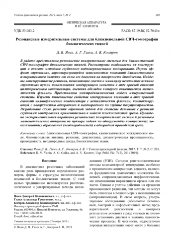 Резонансные измерительные системы для ближнепольной СВЧ-томографии биологических тканей 201