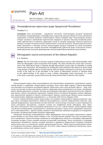 Цель исследования - разработать типологию этнокультурных ресурсов Удмуртской Республики, которая формирует этнографическую туристскую среду республики. В статье описывается современное состояние развития этнокультурного облика Удмуртии через этнокультурные ресурсы, которые заложены в действующие туристические маршруты и проекты. Показаны механизмы реализации туристического потенциала территории, исходя из наличия конкретных объектов туристского интереса, которые в большей степени сосредоточены в сельской местности. Научная новизна исследования заключается в описании системы этнокультурных ресурсов Удмуртии на основе культурного наследия региона для создания целостной этнографической туристской среды. В результате исследования предложена типология, формирующая этнокультурный бренд идентичности республики.