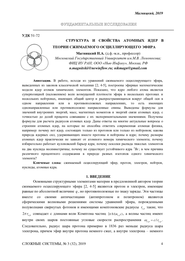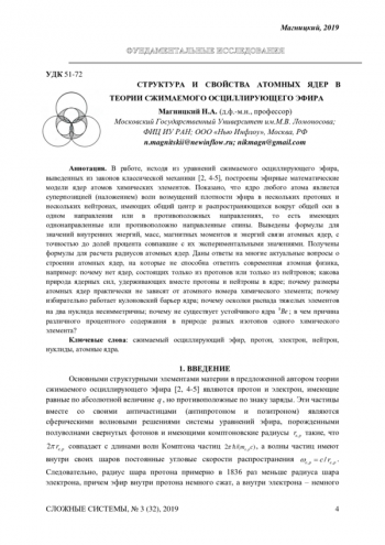 В работе, исходя из уравнений сжимаемого осциллирующего эфира, выведенных из законов классической механики [2, 4-5], построены эфирные математические модели ядер атомов химических элементов. Показано, что ядро любого атома является суперпозицией (наложением) волн возмущений плотности эфира в нескольких протонах и нескольких нейтронах, имеющих общий центр и распространяющихся вокруг общей оси в одном направлении или в противоположных направлениях, то есть имеющих однонаправленные или противоположно направленные спины. Выведены формулы для значений внутренних энергий, масс, магнитных моментов и энергий связи атомных ядер, с точностью до долей процента совпавшие с их экспериментальными значениями. Получены формулы для расчета радиусов атомных ядер. Даны ответы на многие актуальные вопросы о строении атомных ядер, на которые не способна ответить современная атомная физика, например: почему нет ядер, состоящих только из протонов или только из нейтронов; какова природа ядерных сил, удерживающих вместе протоны и нейтроны в ядре; почему размеры атомных ядер практически не зависят от атомного номера химического элемента; почему избирательно работает кулоновский барьер ядра; почему осколки распада тяжелых элементов на два нуклида несимметричны; почему не существует устойчивого ядра ; в чем причина различного процентного содержания в природе разных изотопов одного химического элемента?