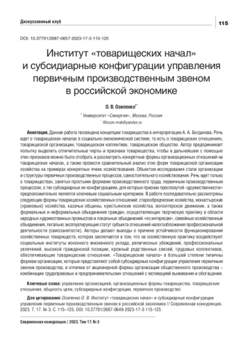 Данная работа посвящена концепции товарищества в интерпретации А. А. Богданова. Речь идет о товарищеских началах в социально-экономической системе, то есть о товарищеских отношениях, товарищеской организации, товарищеском коллективе, товарищеском обществе. Автор предпринимает попытку выделить отличительные черты и признаки товарищества, чтобы в дальнейшем с помощью этих признаков можно было отобрать и рассмотреть конкретные формы организационных отношений на товарищеских началах, а также провести сравнительный анализ этих форм товарищеской организации хозяйства на примерах конкретных ячеек хозяйствования. Объектом исследования стали организации и структуры первичных производственных процессов, самостоятельного хозяйствования. Речь идет только о товариществах, занятых простыми формами производственного труда, первичным производственным процессом, о тех субсидиарных их конфигурациям, для которых признак пресловутой «дружественности» предположительно является ключевым социальным критерием. В работе последовательно рассмотрены следующие формы товарищеских хозяйственных отношений: старообрядческие хозяйства, монастырские (храмовые) хозяйства, казачьи общины, крестьянские хозяйства, волонтерское движение, а также формальные и неформальные объединения граждан, осуществляющих творческую практику в области народных художественных промыслов и локальных объединений «по интересам», семейные хозяйственные объединения, легально эксплуатирующие статут субъекта отношений налогообложения профессиональной деятельности (самозанятости). Авторы делают выводы о причине устойчивости функционирования хозяйственных товариществ, которая заключается в том, что на хозяйственную практику воздействуют социальные институты исконного жизненного уклада, религиозных убеждений, профессиональных увлечений, высокой гражданской позиции, кровный родственных связей, трудовых коллективов, обеспечивающие товарищеские отношения. «Товарищеские начала» в большей степени типичны формам организации, которые представляют собой субсидиарные конфигурации управления первичным звеном производства, в отличии от акционерной формы организации общественного производства - комбинации трудоправовых и предпринимательских отношений с мотивацией выживания и обогащения.
