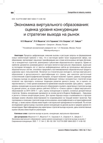 Процессы цифровизации, внешние вызовы и растущие запросы на формирование новых компетенций привели к тому, что в настоящее время такая традиционная сфера, как образование, претерпевает серьезную трансформацию как в плане используемых методов обучения, так и конкурентных стратегий, реализуемых субъектами образовательного процесса. Одним из наиболее динамично развивающиихся секторов является виртуальное образование, выросшее за последние пятнадцать лет от простых информационных сайтов до полноценных виртуальных образовательных систем, способных предложить кастомизированные образовательные продукты широкому кругу пользователей. Несмотря на относительную молодость сектора виртуального образования и дискуссионность идентификации его границ, уже накоплен достаточный статистический и фактографический материал, который позволяет оценить уровень конкуренции и барьеры выхода на данный рынок. Идентификация типовых конкурентных стратегий входа позволит как проследить основные тенденции развития данного рынка, так и оценить их перспективность с точки зрения возможности применения новыми игроками. Цель работы - оценить уровень конкуренции на рынке виртуального образования и выявить характерные стратегии выхода на данный рынок; на основе данных рейтинга EdTech и «Списка сделок в сфере виртуального образовавния за 2014-2016 гг.» дать оценку конкуренции и выявить основные дескриптивные стратегии. Уровень конкуренции оценивался на основе расчета Индекса Херфиндаля - Хиршмана и расчета степени концентрации рынка. Для оценки барьера входа и выживаемости стартапов проведен анализ объемов инвестирования по сохранившимся на текущий момент проектам. При группировке и описании стратегий входа использовались монографический и историографический методы, а также анализ объема инвестиций и секторальной принадлежности компаний. По итогам исследования сделан вывод о высоком уровне конкуренции на данном рынке и среднем уровне его концентрации. Идентифицирован ряд характерных стратегий выхода на рынок, даны количественные оценки объема инвестиций их реализации.
