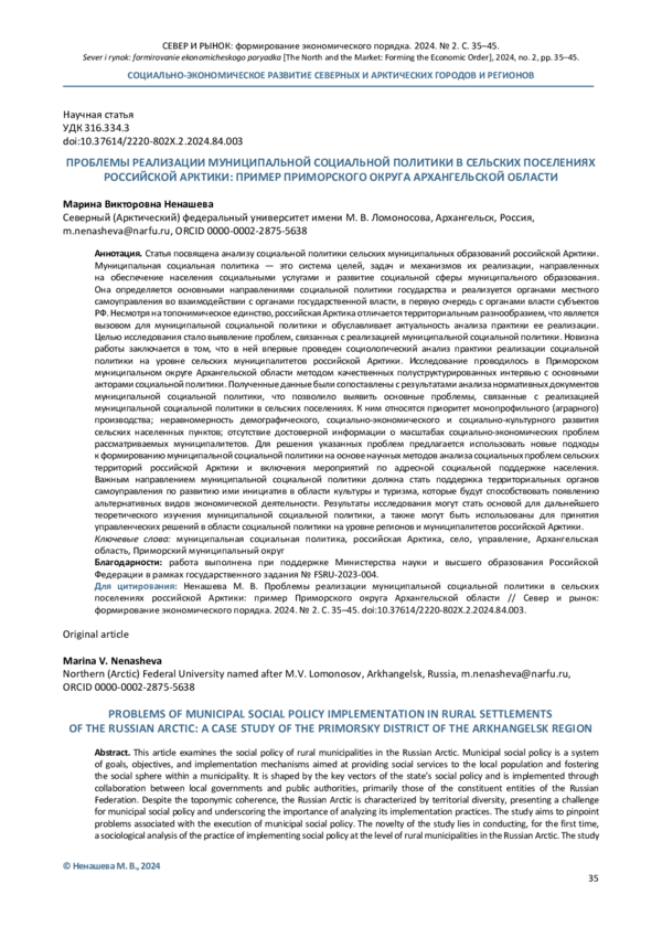 Статья посвящена анализу социальной политики сельских муниципальных образований российской Арктики. Муниципальная социальная политика — это система целей, задач и механизмов их реализации, направленных на обеспечение населения социальными услугами и развитие социальной сферы муниципального образования. Она определяется основными направлениями социальной политики государства и реализуется органами местного самоуправления во взаимодействии с органами государственной власти, в первую очередь с органами власти субъектов РФ. Несмотря на топонимическое единство, российская Арктика отличается территориальным разнообразием, что является вызовом для муниципальной социальной политики и обуславливает актуальность анализа практики ее реализации. Целью исследования стало выявление проблем, связанных с реализацией муниципальной социальной политики. Новизна работы заключается в том, что в ней впервые проведен социологический анализ практики реализации социальной политики на уровне сельских муниципалитетов российской Арктики. Исследование проводилось в Приморском муниципальном округе Архангельской области методом качественных полуструктурированных интервью с основными акторами социальной политики. Полученные данные были сопоставлены с результатами анализа нормативных документов муниципальной социальной политики, что позволило выявить основные проблемы, связанные с реализацией муниципальной социальной политики в сельских поселениях. К ним относятся приоритет монопрофильного (аграрного) производства; неравномерность демографического, социально-экономического и социально-культурного развития сельских населенных пунктов; отсутствие достоверной информации о масштабах социально-экономических проблем рассматриваемых муниципалитетов. Для решения указанных проблем предлагается использовать новые подходы к формированию муниципальной социальной политики на основе научных методов анализа социальных проблем сельских территорий российской Арктики и включения мероприятий по адресной социальной поддержке населения. Важным направлением муниципальной социальной политики должна стать поддержка территориальных органов самоуправления по развитию ими инициатив в области культуры и туризма, которые будут способствовать появлению альтернативных видов экономической деятельности. Результаты исследования могут стать основой для дальнейшего теоретического изучения муниципальной социальной политики, а также могут быть использованы для принятия управленческих решений в области социальной политики на уровне регионов и муниципалитетов российской Арктики.