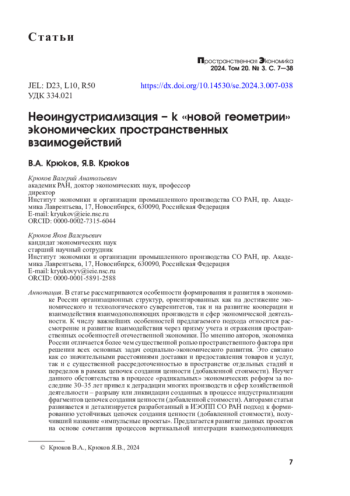 КРЮКОВ В. А., КРЮКОВ Я. В. НЕОИНДУСТРИАЛИЗАЦИЯ - К "НОВОЙ ГЕОМЕТРИИ" ЭКОНОМИЧЕСКИХ ПРОСТРАНСТВЕННЫХ ВЗАИМОДЕЙСТВИЙ // ПРОСТРАНСТВЕННАЯ ЭКОНОМИКА. 2024. ТОМ 20 № 3