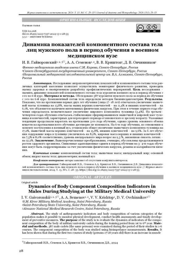 http://rep.bsmu.by/bitstream/handle/BSMU/281 11/page_266.pdf?sequence=1&isAllowed=y - Гайворонский И.В., Семенов А.А. Показатели физического развития девушек-абитуриенток военной образовательной организации по данным антропометрического исследования и компонентного состава тела. Человек и его здоровье. 2022;25(4):54–62. doi: