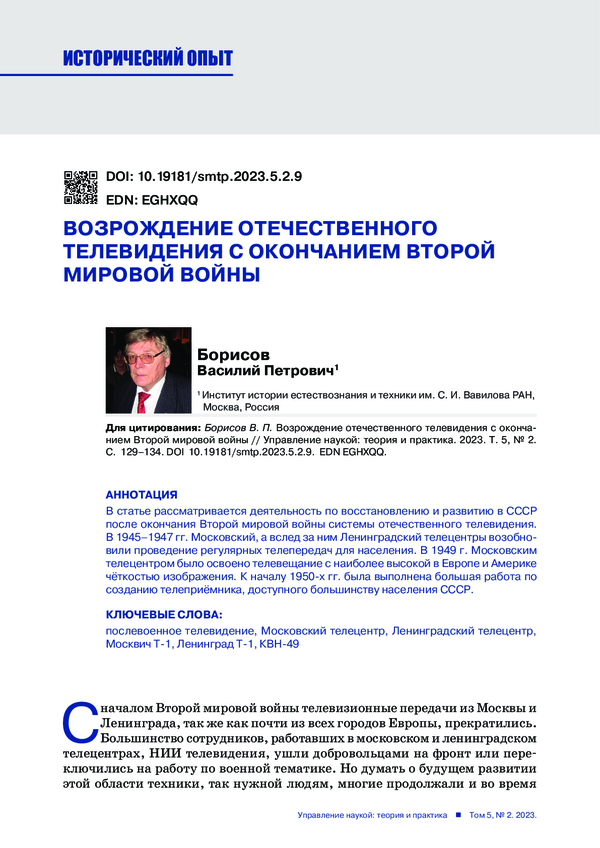 В статье рассматривается деятельность по восстановлению и развитию в СССР после окончания Второй мировой войны системы отечественного телевидения. В 1945-1947 гг. Московский, а вслед за ним Ленинградский телецентры возобновили проведение регулярных телепередач для населения. В 1949 г. Московским телецентром было освоено телевещание с наиболее высокой в Европе и Америке чёткостью изображения. К началу 1950-х гг. была выполнена большая работа по созданию телеприёмника, доступного большинству населения СССР.