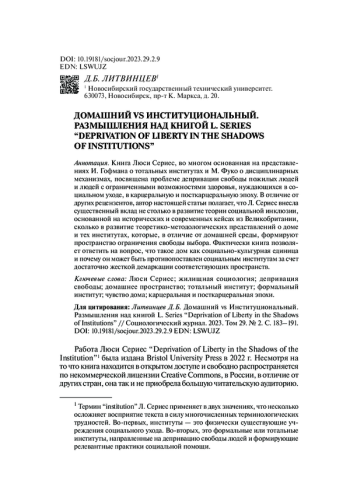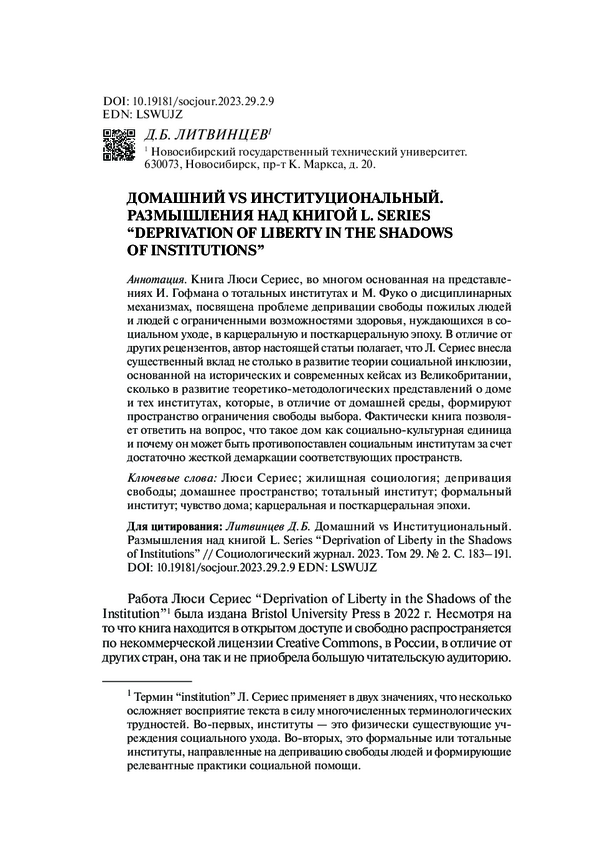 Книга Люси Сериес, во многом основанная на представлениях И. Гофмана о тотальных институтах и М. Фуко о дисциплинарных механизмах, посвящена проблеме депривации свободы пожилых людей и людей с ограниченными возможностями здоровья, нуждающихся в социальном уходе, в карцеральную и посткарцеральную эпоху. В отличие от других рецензентов, автор настоящей статьи полагает, что Л. Сериес внесла существенный вклад не столько в развитие теории социальной инклюзии, основанной на исторических и современных кейсах из Великобритании, сколько в развитие теоретико-методологических представлений о доме и тех институтах, которые, в отличие от домашней среды, формируют пространство ограничения свободы выбора. Фактически книга позволяет ответить на вопрос, что такое дом как социально-культурная единица и почему он может быть противопоставлен социальным институтам за счет достаточно жесткой демаркации соответствующих пространств.