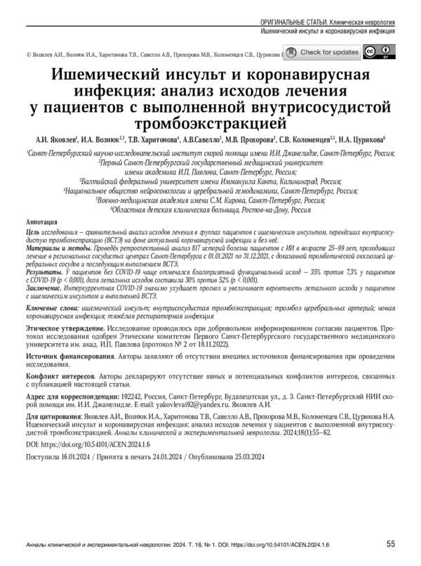 Цель исследования — сравнительный анализ исходов лечения в группах пациентов с ишемическим инсультом, перенёсших внутрисосудистую тромбоэкстракцию (ВСТЭ) на фоне актуальной коронавирусной инфекции и без неё.