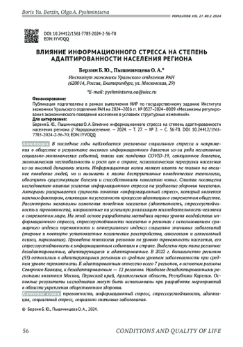 В последние годы наблюдается увеличение социального стресса и напряжения в обществе в результате высокого информационного давления из-за ряда негативных социально-экономических событий, таких как пандемия COVID-19, санкционное давление, экономическая нестабильность и рост цен в стране, психологическая перегрузка населения из-за высокой динамики жизни. Информационная волна может влиять не только на внешнее поведение людей, но и вызывать к жизни деструктивные поведенческие технологии, обострять существующие болезни и способствовать появлению новых. Статья посвящена исследованию влияния усиления информационного стресса на ухудшение здоровья населения. Авторами раскрывается сущность понятия «информационный стресс», который является важным фактором, влияющим на успешность процессов адаптации в современном обществе. Рассмотрены механизмы изменения поведения населения (адаптивность, стрессоустойчивость и тревожность), направленные на успешную реализацию жизнедеятельности человека в современном мире. На этой основе разработана методика оценки уровня воздействия информационного стресса, стрессоустойчивости населения в регионах с использованием суммарного индекса тревожности и интегрального индекса социально значимых заболеваний (впервые и повторно установленные психические расстройства, алкоголизм и алкогольный психоз, наркомания). Проведена типология регионов по уровню тревожности населения, его стрессоустойчивости к информационным событиям в стране. Выделены три типа регионов: дезадаптированные, адаптирующиеся и адаптированные. В 2022 г. большинство регионов (55) относились к адаптирующимся регионам со средним уровнем заболеваемости при среднем уровне тревожности. К адаптированным отнесено всего 7 регионов, в основном регионы Северного Кавказа, к дезадаптированным - 12 регионов. Наиболее дезадаптированными регионами являются Москва, Пермский край, Архангельская область, Республика Карелия. Основные результаты исследования могут быть использованы при разработке мероприятий в области укрепления общественного здоровья.