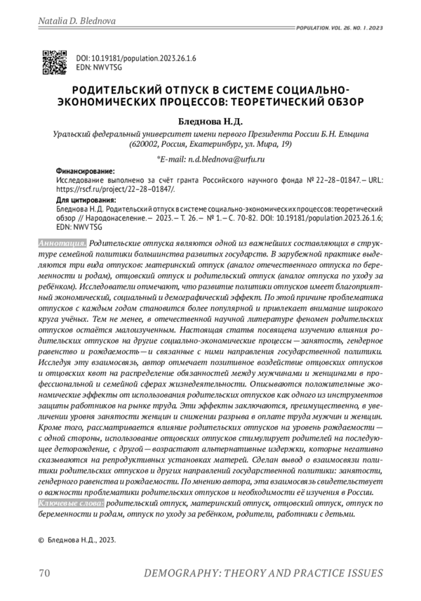 - Bergemann, A. Maternal employment effects of paid parental leave / A. Bergemann, R. T. Riphahn // Journal of Population Economics. - 2022. DOI: 10.1007/s00148-021-00878-7