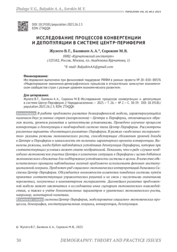 В работе предложено развитие демографической модели, характеризующейся наличием двух условных страт (мегарегионов) - Центра и Периферии, отличающихся образом жизни, уровнем развития и ценностными установками. Проведено изучение процессов конвергенции и депопуляции в неоднородной системе типа Центр-Периферия. Рассмотрены различные варианты «догоняющего развития» Периферии. В рамках «модельных экспериментов» указаны режимы экономического роста, способствующие сближению уровней дохода в Центре и Периферии в зависимости от величины характерного времени конвергенции. Выявлены режимы, когда будет наблюдаться устойчивая депопуляция Периферии, которая при соответствующих условиях может стать необратимой. Показано, что в ряде случаев необходимо экономическое участие Центра в изменении ситуации в Периферии с целью добиться экономического сближения для поддержания устойчивости системы в целом. В качестве объяснительного принципа наблюдаемых явлений предложено использовать феномен институциональной ловушки. Предложен ряд социально-экономических интерпретаций динамики Системы Центр-Периферия. Обсуждается возможность изменения поведения системы путём принятия соответствующих управленческих решений и их связь с численными значениями переменных, полученных в компьютерном эксперименте. Дальнейшее развитие предложенной модели может заключаться в исследовании иных сценариев экономического взаимодействия, а также в учёте дополнительных параметров в уравнениях экономического роста, например, монетарной политики.