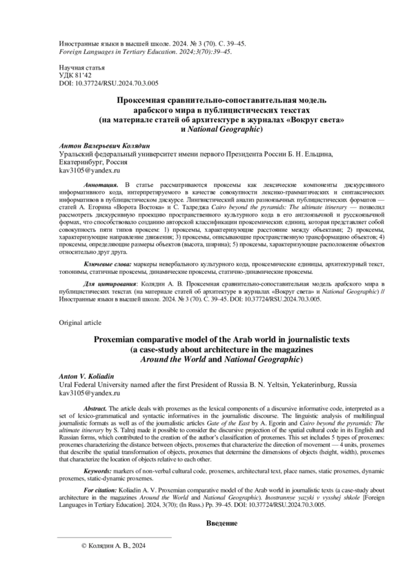КОЛЯДИН А. В. ПРОКСЕМНАЯ СРАВНИТЕЛЬНО-СОПОСТАВИТЕЛЬНАЯ МОДЕЛЬ АРАБСКОГО МИРА В ПУБЛИЦИСТИЧЕСКИХ ТЕКСТАХ (НА МАТЕРИАЛЕ СТАТЕЙ ОБ АРХИТЕКТУРЕ В ЖУРНАЛАХ "ВОКРУГ СВЕТА" И NATIONAL GEOGRAPHIC) // ИНОСТРАННЫЕ ЯЗЫКИ В ВЫСШЕЙ ШКОЛЕ. 2024. №3