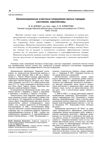Бытовые сточные воды в малых городах, как правило, отводятся по системе централизованной канализации, подвергаются очистке и сбрасываются в ближайший водоем. Обследование действующих и эксплуатирующихся длительное время канализационных сооружений малых городов говорит о необходимости их безотлагательной модернизации. Приведены результаты работ, выполненных для ЖКХ г. Кедровый Томской области, по обследованию действующей канализационной станции очистки бытовых сточных вод на предмет ее технического состояния, эффективности очистки сточных вод на отдельных узлах и сооружениях и энергоэффективности станции. Приведены результаты проверки качества очистки сточных вод на очистной станции, внесены предложения по модернизации очистных сооружений и снижению энергопотребления.