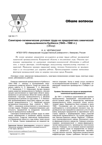 На основе архивных документов исследуются условия труда рабочих предприятий химической промышленности Кемеровской области в послевоенные годы. Описаны проводимые мероприятия по улучшению санитарно-гигиенической обстановки в рабочей зоне, а также факторы, способствующие замедленному строительству очистных сооружений. Приведены примеры нарушений правил техники безопасности на предприятиях и их последствия для здоровья рабочих. Проанализировано влияние патогенных факторов промышленной зоны на здоровье населения города Кемерово.
