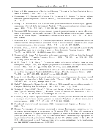 - Borras F., Ruiz J.L., Sirvent I. Planning improvements through data envelopment analysis (DEA) benchmarking based on a selection of peers // Socio–Economic Planning Sciences. – 2024. – Т. 95. – pp. 102020. doi: 10.1016/j.seps.2024.102020.