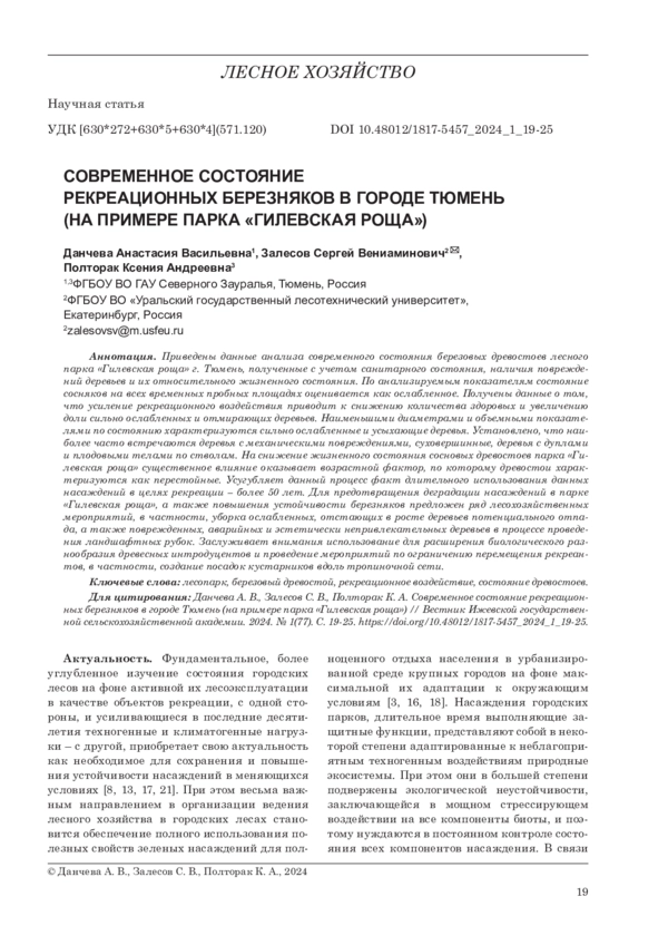 ДАНЧЕВА А. В., ЗАЛЕСОВ С. В., ПОЛТОРАК К. А. СОВРЕМЕННОЕ СОСТОЯНИЕ РЕКРЕАЦИОННЫХ БЕРЕЗНЯКОВ В ГОРОДЕ ТЮМЕНЬ (НА ПРИМЕРЕ ПАРКА "ГИЛЕВСКАЯ РОЩА") // ВЕСТНИК ИЖЕВСКОЙ ГОСУДАРСТВЕННОЙ СЕЛЬСКОХОЗЯЙСТВЕННОЙ АКАДЕМИИ. 2024. № 1