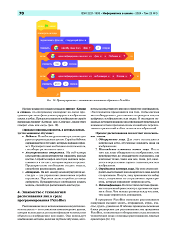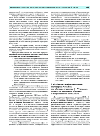 В статье рассматриваются вопросы ознакомления обучающихся с основами искусственного интеллекта в процессе организации обучения программированию во внеурочной деятельности, а также возможности, предоставляемые средой программирования PictoBlox в процессе организации обучения программированию во внеурочной деятельности учащихся пятых и шестых классов. Приведен краткий обзор данной среды программирования, рассмотрен процесс создания проектов с использованием машинного обучения и искусственного интеллекта. Приведены примеры проектов, в которых используются элементы машинного обучения и искусственного интеллекта. Материалы статьи познакомят учителей информатики и педагогов дополнительного образования с основными методическими подходами к использованию среды программирования PictoBlox в образовательном процессе и будут способствовать организации занятий внеурочной деятельности с использованием данного программного обеспечения.