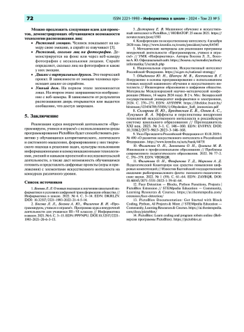 7. Обыденков Ю. Н., Шевчук М. В., Костякова В. Г. Погружение в основы программирования с использованием готовых модулей машинного обучения и искусственного интеллекта // Инженерное образование в цифровом обществе. Материалы Международной научно-методической конференции (Минск, 14 марта 2024 года). В 2 ч. Мн.: Белорусский государственный университет информатики и электроники, 2024. С. 270–271. EDN: AYSYHW. https://libeldoc.bsuir.by/ bitstream/123456789/55056/1/Obydenkov_Soft_immersion.pdf