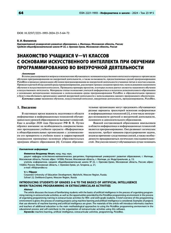 2. Босова Л. Л., Босова А. Ю., Филиппов В. И. «Программируем, учимся и играем!». Программа курса внеурочной деятельности для учащихся III—VI классов // Информатика в школе. 2021. № 6. С. 3–15. EDN: PPFNPU. DOI:10.32517/2221- 1993-2021-20-6-3-15.