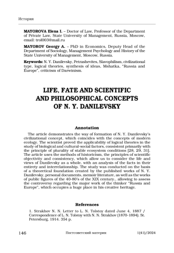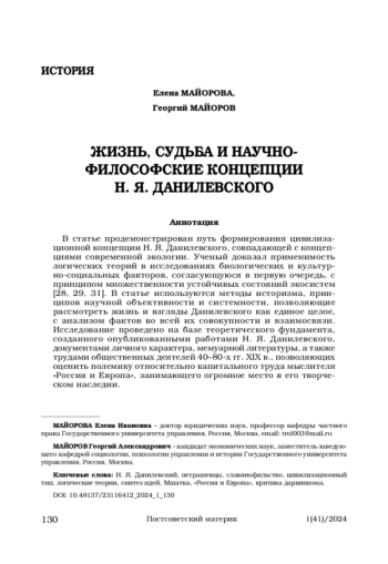 В статье продемонстрирован путь формирования цивилизационной концепции Н. Я. Данилевского, совпадающей с концепциями современной экологии. Ученый доказал применимость логических теорий в исследованиях биологических и культурно-социальных факторов, согласующуюся в первую очередь, с принципом множественности устойчивых состояний экосистем [28, 29, 31]. В статье используются методы историзма, принципов научной объективности и системности, позволяющие рассмотреть жизнь и взгляды Данилевского как единое целое, с анализом фактов во всей их совокупности и взаимосвязи. Исследование проведено на базе теоретического фундамента, созданного опубликованными работами Н. Я. Данилевского, документами личного характера, мемуарной литературы, а также трудами общественных деятелей 40–80-х гг. XIX в., позволяющих оценить полемику относительно капитального труда мыслителя «Россия и Европа», занимающего огромное место в его творческом наследии.