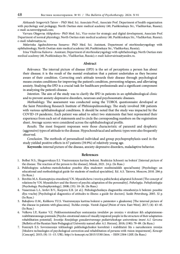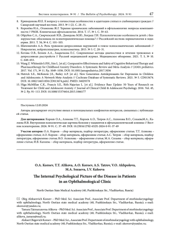 5. Бабайлова О.М., Коликова Ю.С. Внутренняя картина болезни у пациентов с глаукомой // Точка зрения. Восток - Запад. 2017. № 4. С. 43-45. EDN: YUJCNV