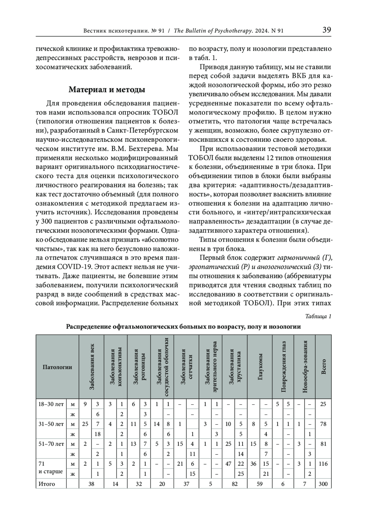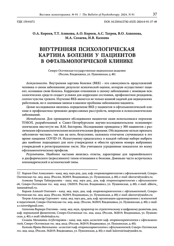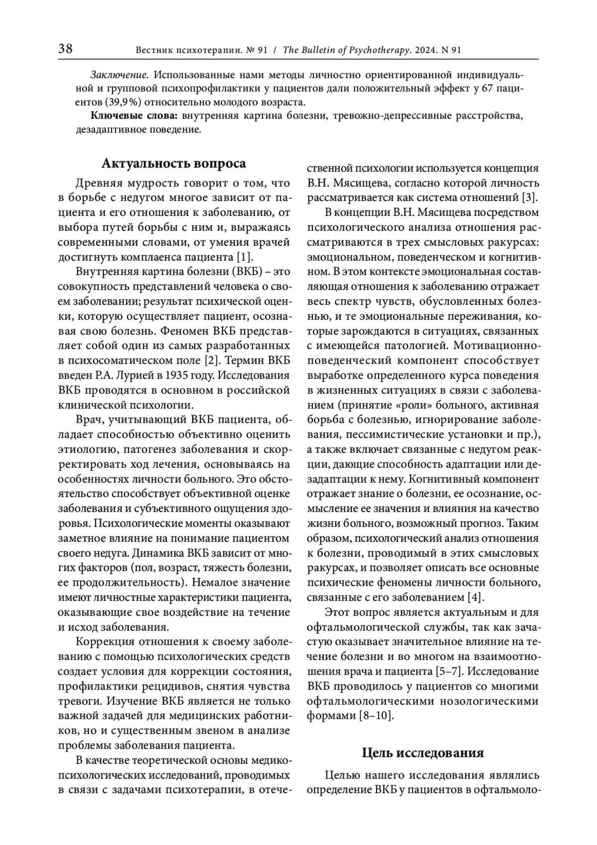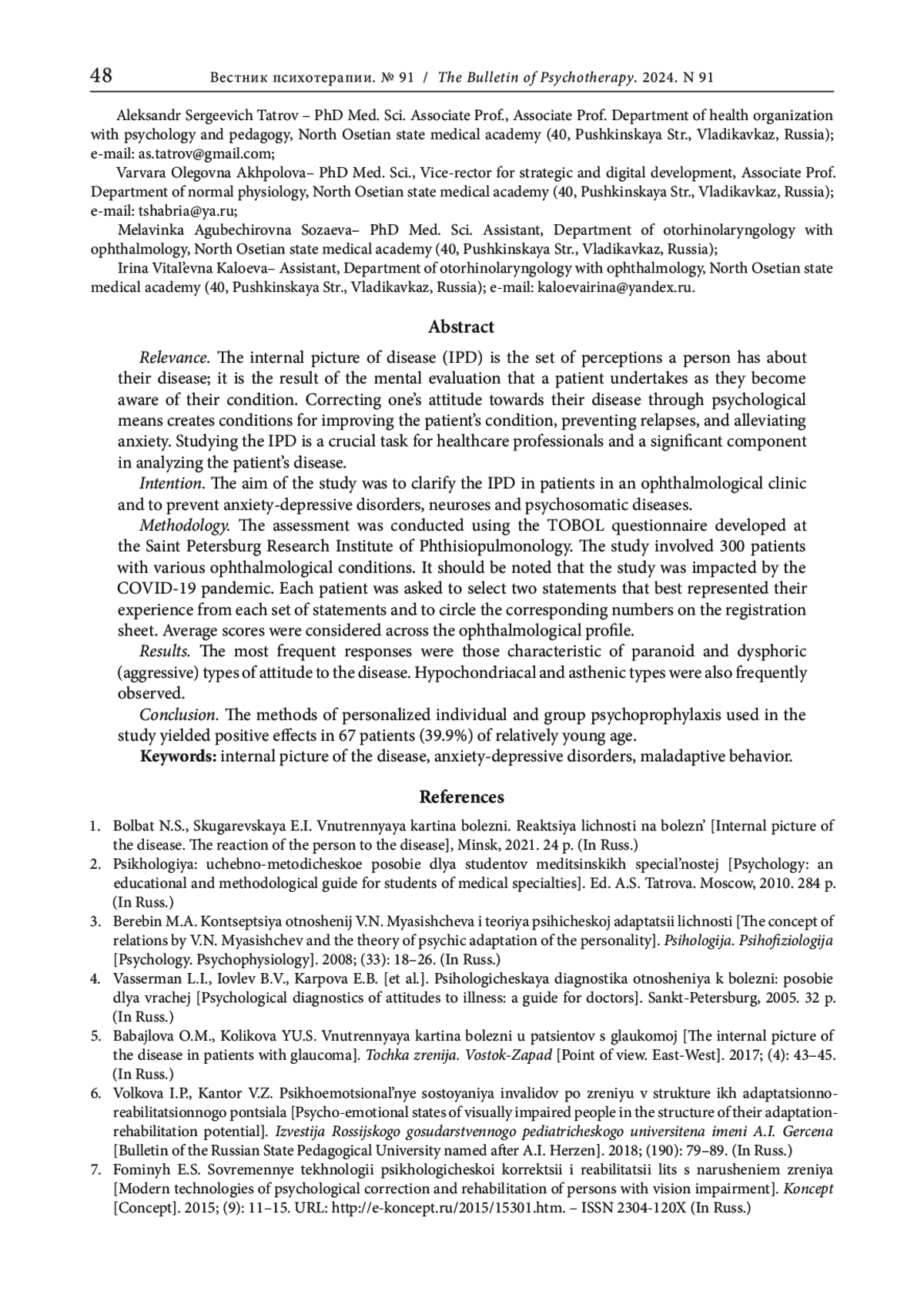 Актуальность. Внутренняя картина болезни (ВКБ) - это совокупность представлений человека о своем заболевании; результат психической оценки, которую осуществляет пациент, осознавая свою болезнь. Коррекция отношения к своему заболеванию с помощью психологических средств создает условия для коррекции состояния, профилактики рецидивов, снятия чувства тревоги. Изучение ВКБ является не только важной задачей для медицинских работников, но и значимым звеном в анализе проблемы заболевания пациента. Целью исследования являлись определение ВКБ у пациентов в офтальмологической клинике и профилактика тревожно-депрессивных расстройств, неврозов и психосоматических заболеваний. Методология. Для проведения обследования пациентов нами использовался опросник ТОБОЛ, разработанный в Санкт-Петербургском научно-исследовательском психоневрологическом институте им. В. М. Бехтерева. Исследования проведены у 300 пациентов с различными офтальмологическими нозологическими формами. Обследование нельзя признать «абсолютно чистым», так как на него, безусловно, наложила отпечаток случившаяся в это время пандемия COVID-19. Испытуемому предлагалось в каждой таблице-наборе выбрать два наиболее подходящих для него утверждения и обвести кружком номера выбранных утверждений в регистрационном листе. Мы учитывали усредненные показатели по всему офтальмологическому профилю.
