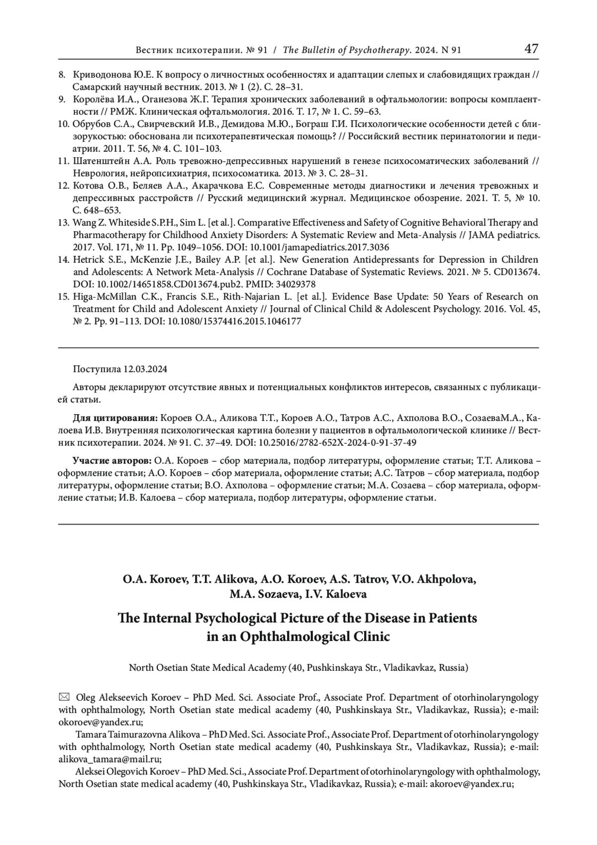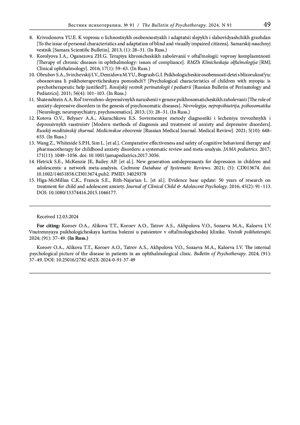 10. Обрубов С.А., Свирчевский И.В., Демидова М.Ю., Бограш Г.И. Психологические особенности детей с близорукостью: обоснована ли психотерапевтическая помощь? // Российский вестник перинатологии и педиатрии. 2011. Т. 56, № 4. С. 101-103. EDN: OCPPKX