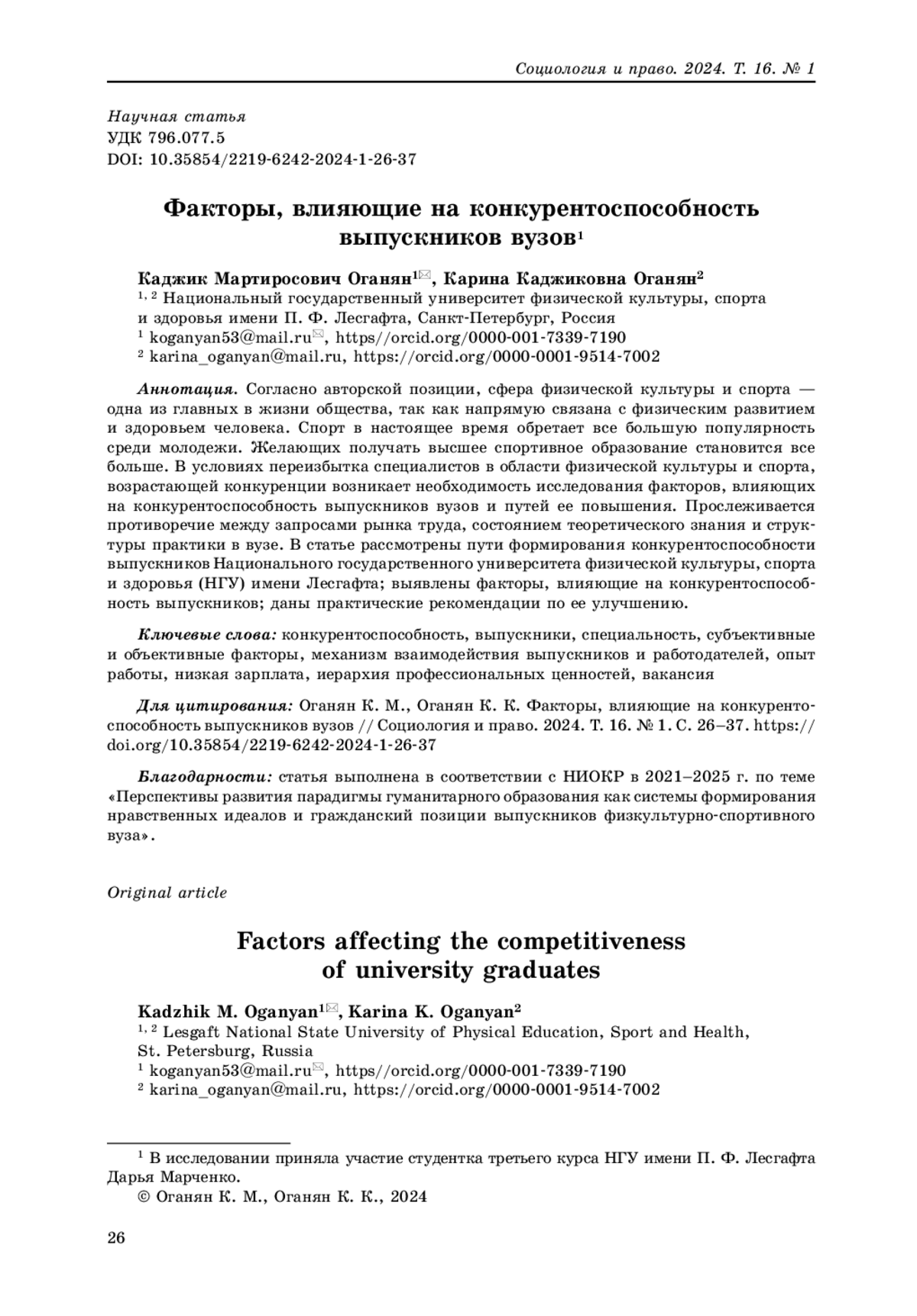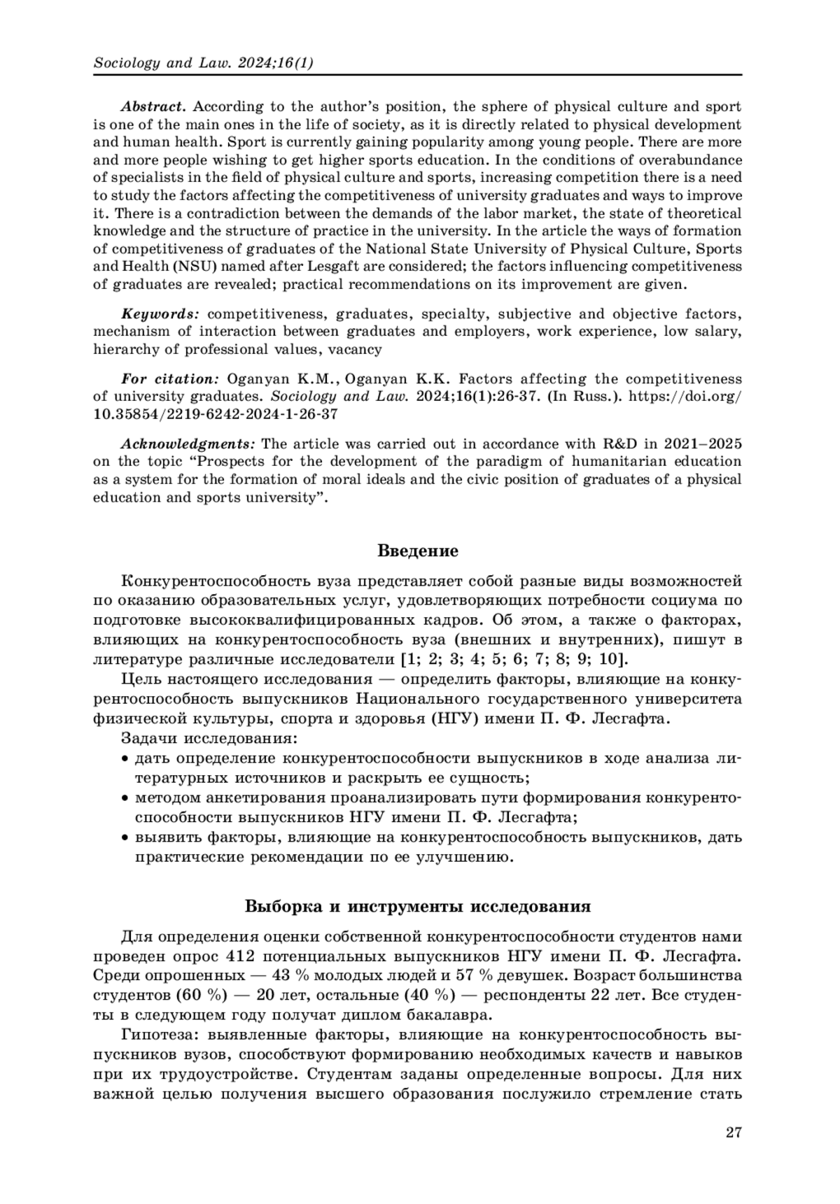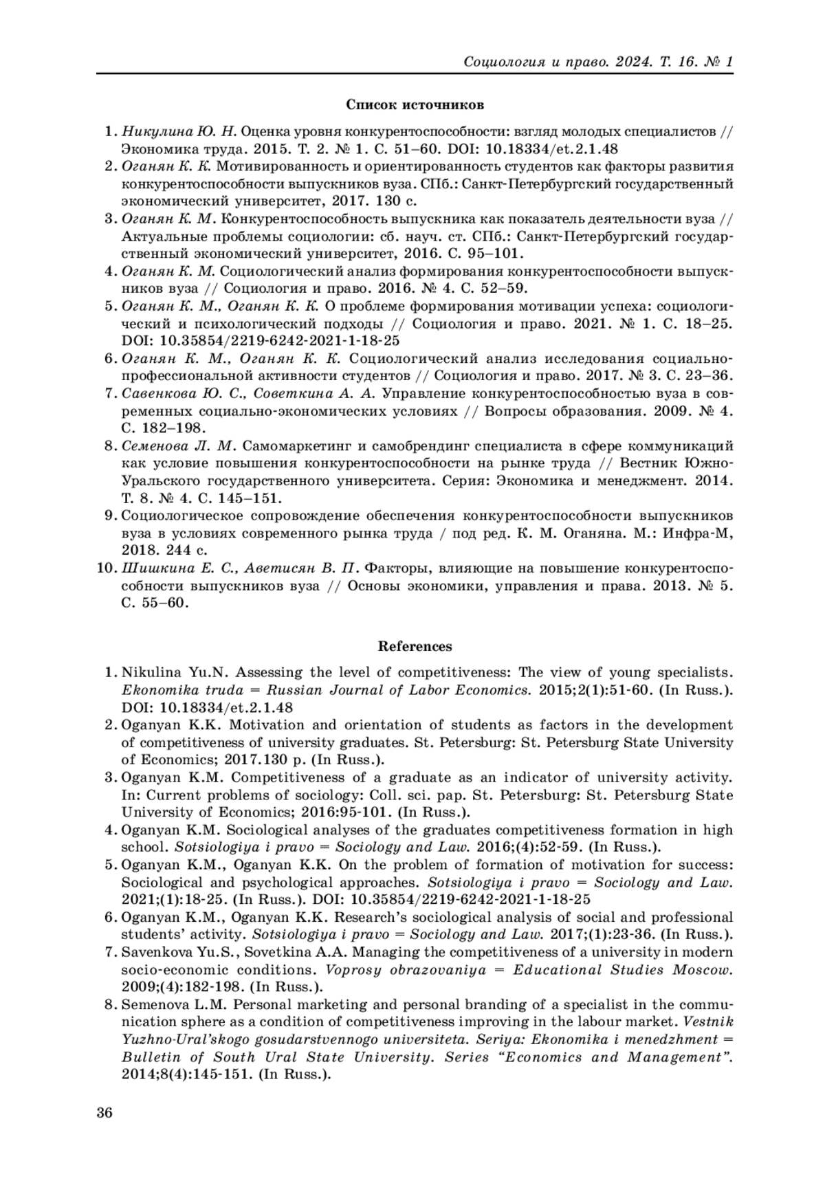 4. Оганян К. М. Социологический анализ формирования конкурентоспособности выпускников вуза // Социология и право. 2016. № 4. С. 52-59.
