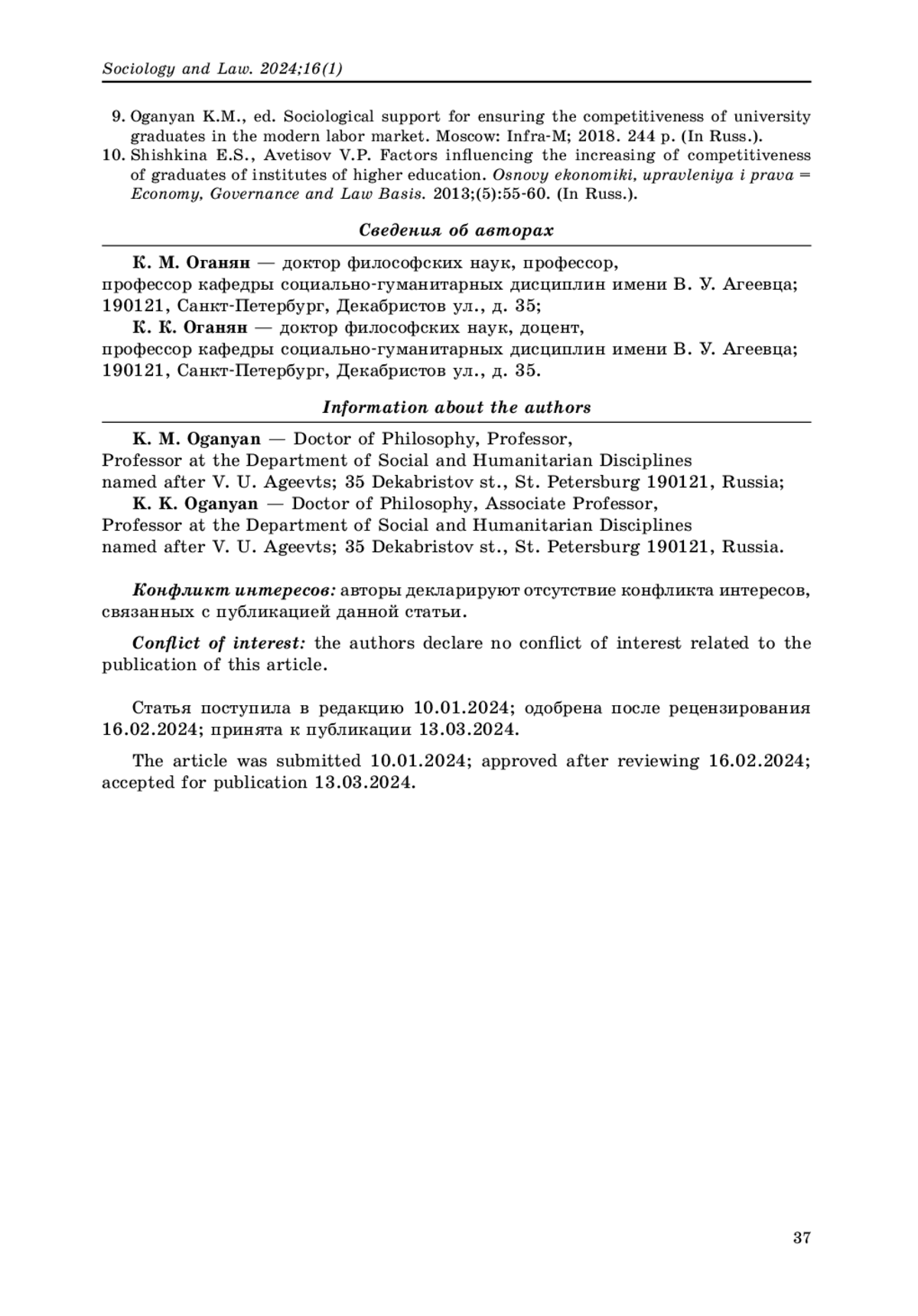 6. Оганян К. М., Оганян К. К. Социологический анализ исследования социально-профессиональной активности студентов // Социология и право. 2017. № 3. С. 23-36.