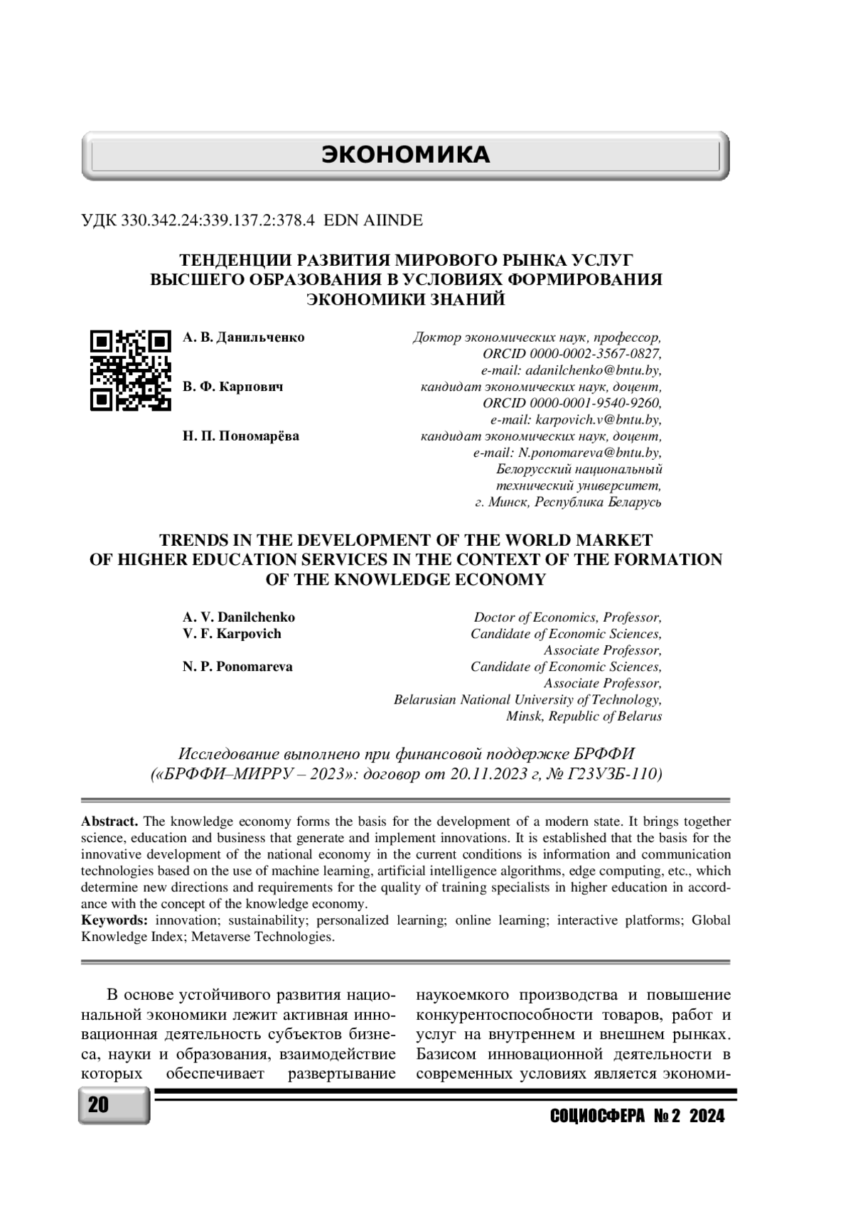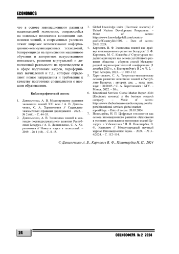 1. Данильченко, А. В. Моделирование развития экономики знаний XXI века / А. В. Данильченко, С. А. Харитонович // Сацыяльна-эканамiчныя i прававыя даследаваннi - 2022. - № 2 (68). - С. 44-53. EDN: XQEDIU