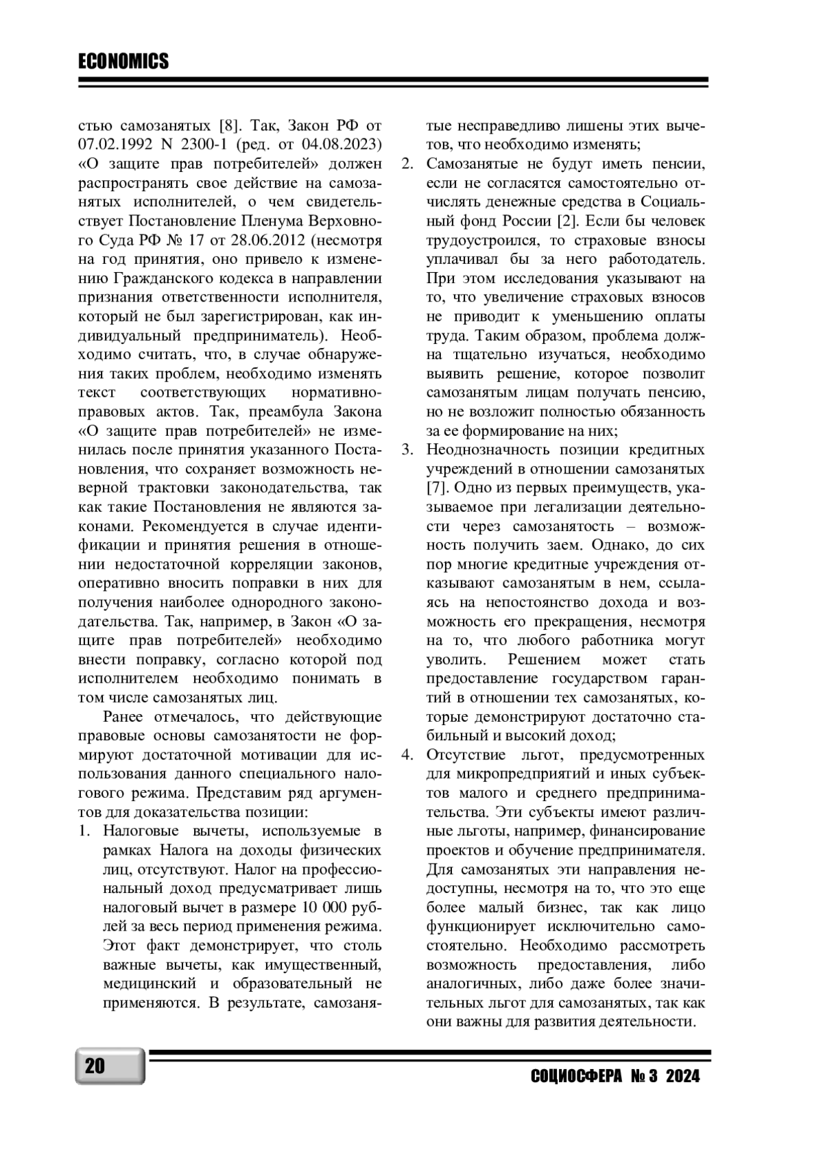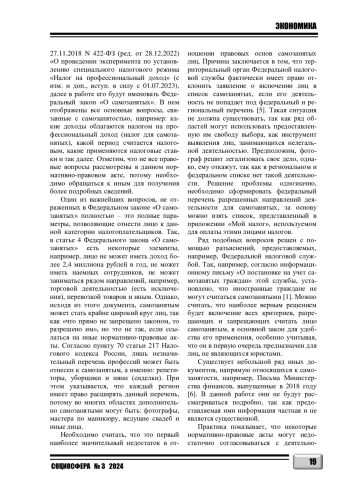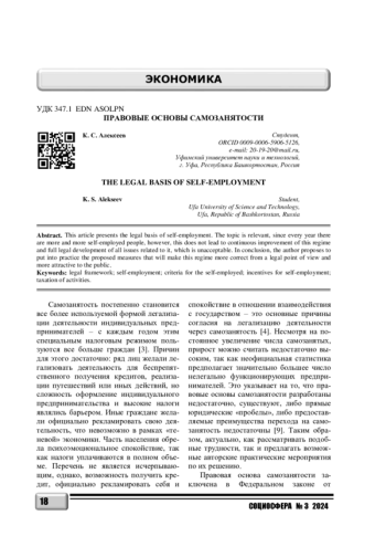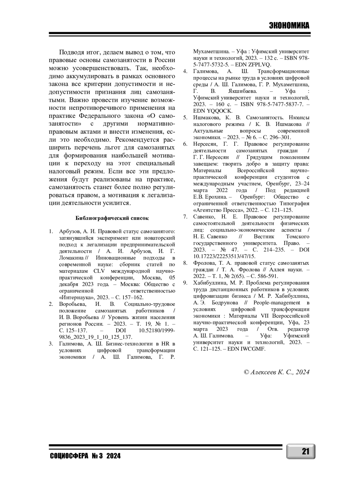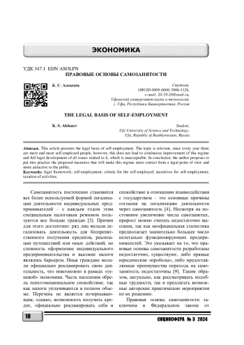 АЛЕКСЕЕВ К. С. ПРАВОВЫЕ ОСНОВЫ САМОЗАНЯТОСТИ // СОЦИОСФЕРА. 2024. № 3