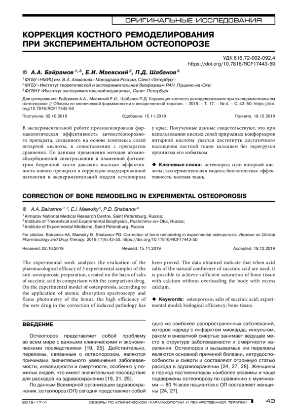 абсорбционной спектроскопии и пламенной фотометрии бедренной кости доказана высокая эффективность нового препарата в коррекции индуцированной патологии в экспериментальной модели остеопороза у крыс. Полученные данные свидетельствуют, что при использовании кислых солей природных конформеров янтарной кислоты удается достигнуть достаточного насыщения костной ткани кальцием без перегрузки организма его избытком.