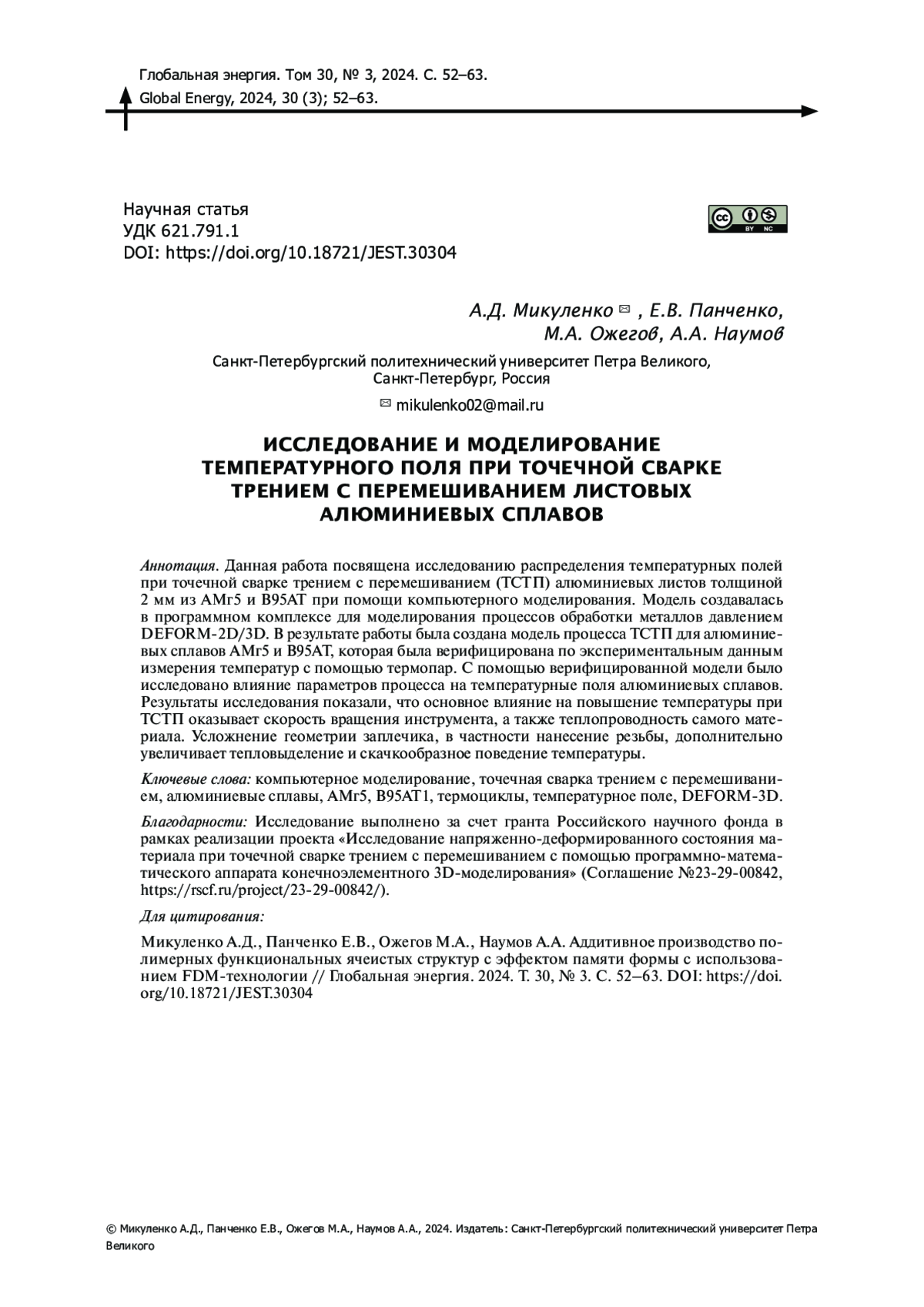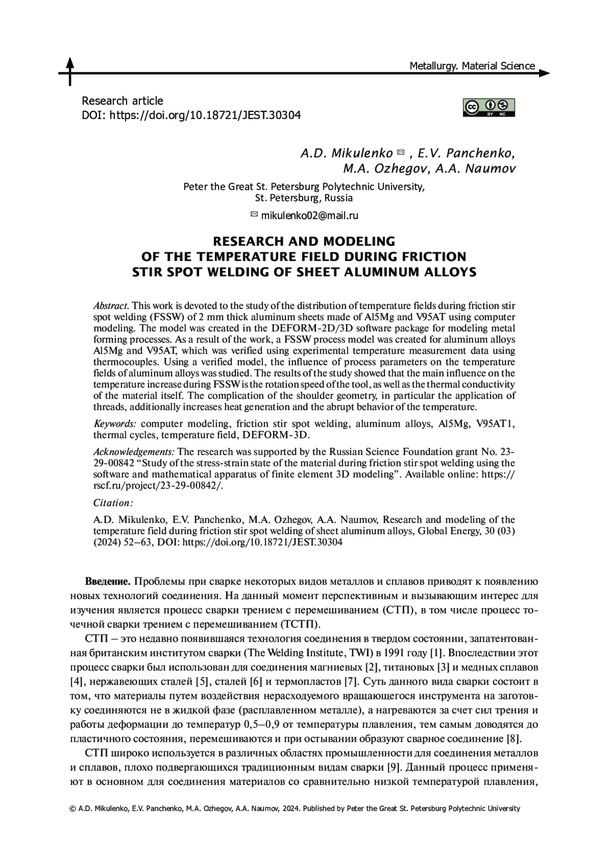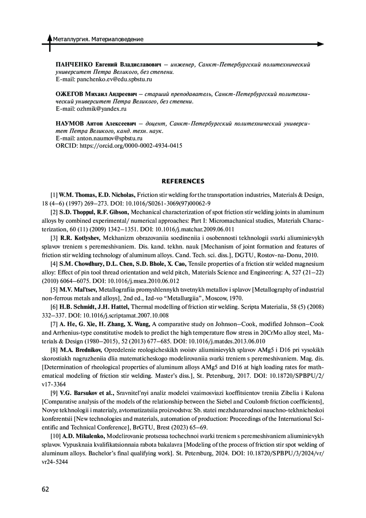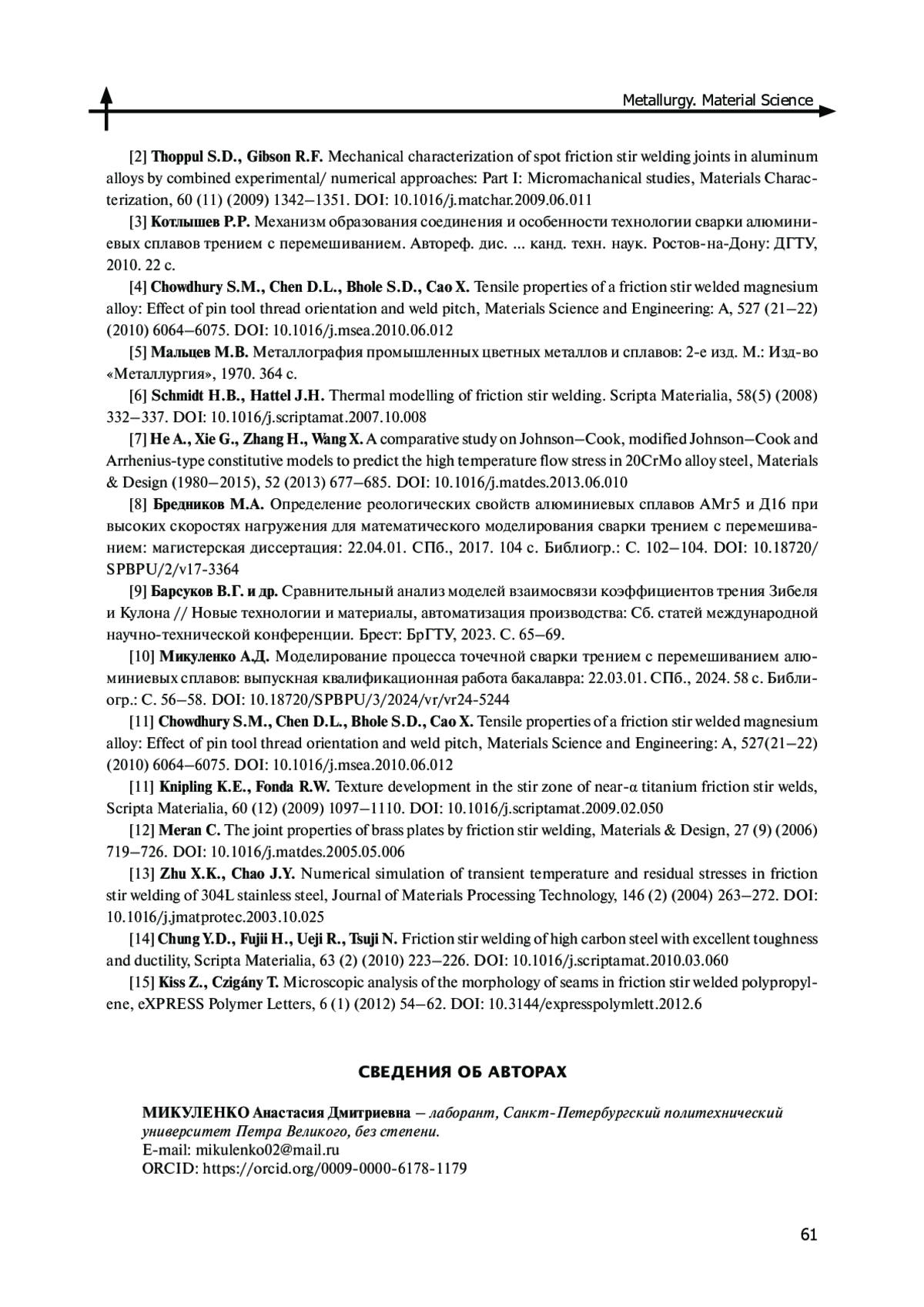 10. Микуленко А.Д. Моделирование процесса точечной сварки трением с перемешиванием алюминиевых сплавов: выпускная квалификационная работа бакалавра: 22.03.01. СПб., 2024. 58 с. Библиогр.: С. 56-58. DOI: 10.18720/SPBPU/3/2024/vr/vr24-5244