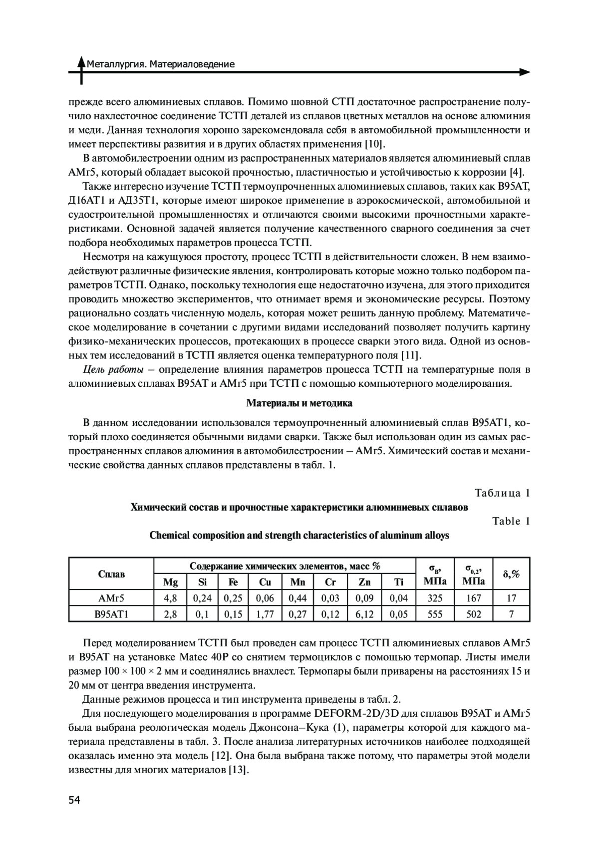 Данная работа посвящена исследованию распределения температурных полей при точечной сварке трением с перемешиванием (ТСТП) алюминиевых листов толщиной 2 мм из АМг5 и В95АТ при помощи компьютерного моделирования. Модель создавалась в программном комплексе для моделирования процессов обработки металлов давлением DEFORM-2D/3D. В результате работы была создана модель процесса ТСТП для алюминиевых сплавов АМг5 и В95АТ, которая была верифицирована по экспериментальным данным измерения температур с помощью термопар. С помощью верифицированной модели было исследовано влияние параметров процесса на температурные поля алюминиевых сплавов. Результаты исследования показали, что основное влияние на повышение температуры при ТСТП оказывает скорость вращения инструмента, а также теплопроводность самого материала. Усложнение геометрии заплечика, в частности нанесение резьбы, дополнительно увеличивает тепловыделение и скачкообразное поведение температуры.