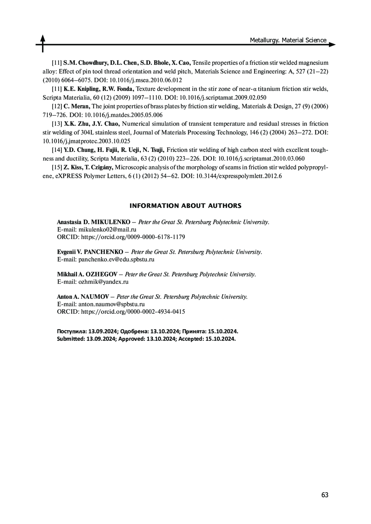15. Chung Y.D., Fujii H., Ueji R., Tsuji N. Friction stir welding of high carbon steel with excellent toughness and ductility, Scripta Materialia, 63 (2) (2010) 223-226. DOI: 10.1016/j.scriptamat.2010.03.060 EDN: NXHMCH