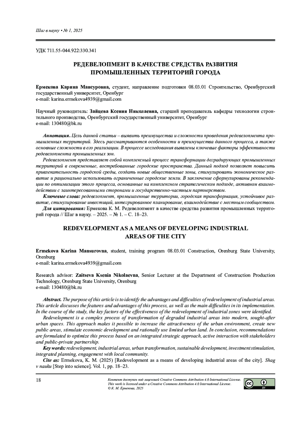 1. Баранова А. В., Жидков О. Н. Редевелопмент промышленных территорий как фактор развития городов // Известия вузов. Инвестиции. Строительство. Недвижимость. - 2018. - Т. 8, № 1. - С. 15-24.