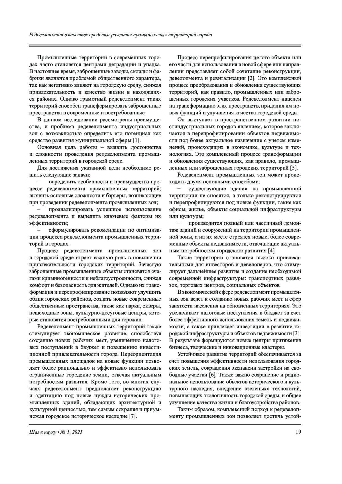 4. Рябова Т. Ф., Капустин А. С. Редевелопмент промышленных отраслей: зарубежный опыт и российская практика // Экономика строительства. - 2020. - № 3. - С. 45-54.