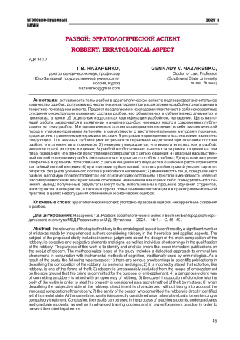 В уголовно-правовой литературе разбой по вполне понятным причинам, которые определяют актуальностm темы, рассматривается в теоретико-прикладном аспекте. Эрратологический аспект темы, связанной с трактовкой разбоя, его признаков и квалификации, затрагивается от случая к случаю, несмотря на то? что ошибочные трактовки разбоя доходят до курьезов и появляются в публикуемых работах все чаще, в том числе в Интернет-пространстве, доступном студентам и магистрантам юридических вузов и факультетов. Указанные лица воспринимают статьи, опубликованные в юридических журналах, в качестве образцов, достойных подражания, и невольно множат ошибки, допущенные неопытными исследователями. Отмеченные факты свидетельствуют о том, что в настоящее время эрратологический аспект стал не менее актуальным, чем теоретико-прикладной аспект разбоя.
