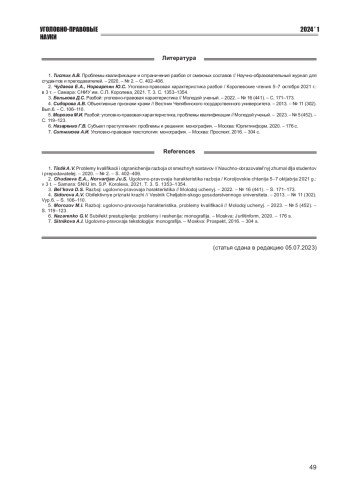 5. Морозов М.И. Разбой: уголовно-правовая характеристика, проблемы квалификации // Молодой ученый. - 2023. - № 5 (452). - С. 119-123. EDN: VHOFZJ