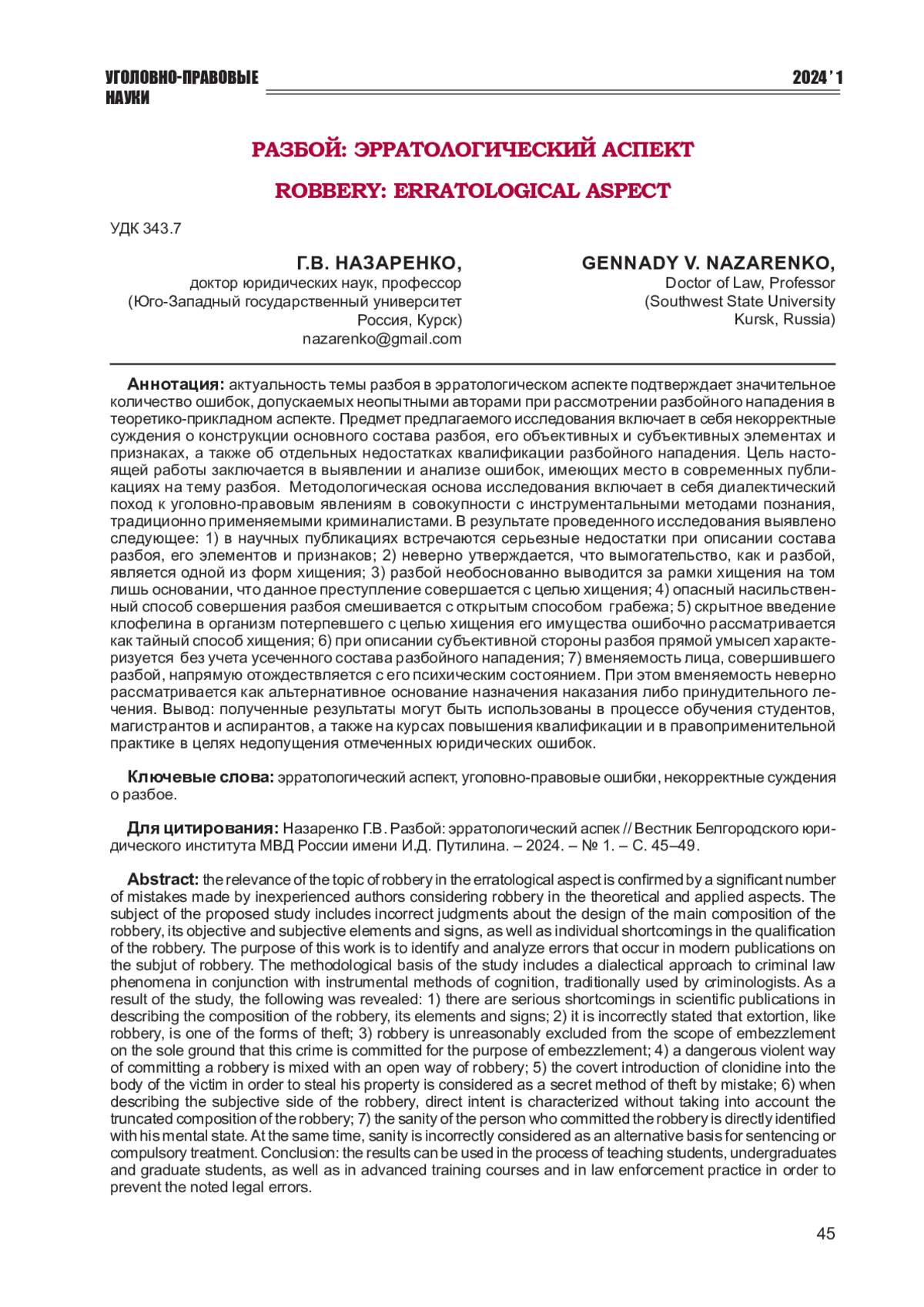 2. Чудаева Е.А., Норвартян Ю.С. Уголовно-правовая характеристика разбоя / Королевские чтения 5-7 октября 2021 г.: в 3 т. - Самара: СНИУ им. С.П. Королева, 2021. Т. 3. С. 1353-1354. EDN: FEDOVS
