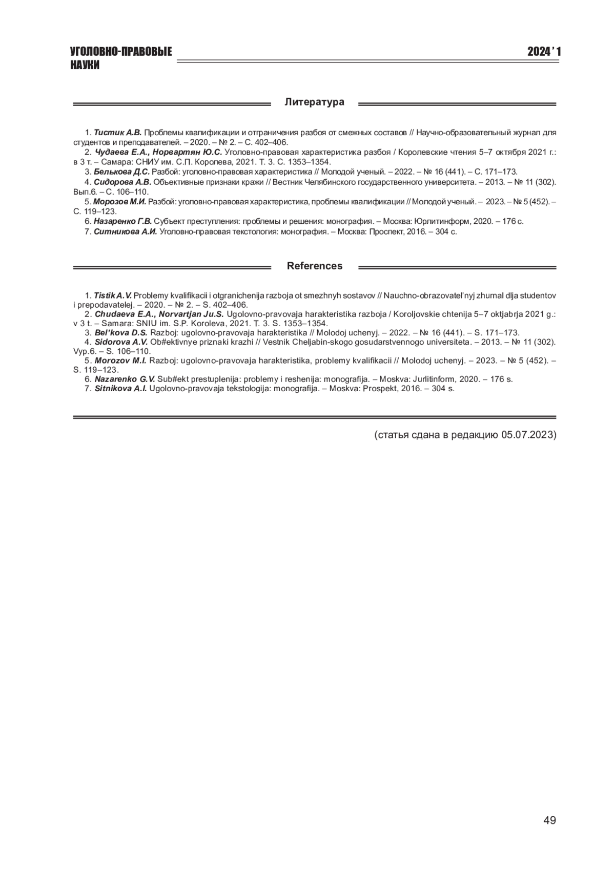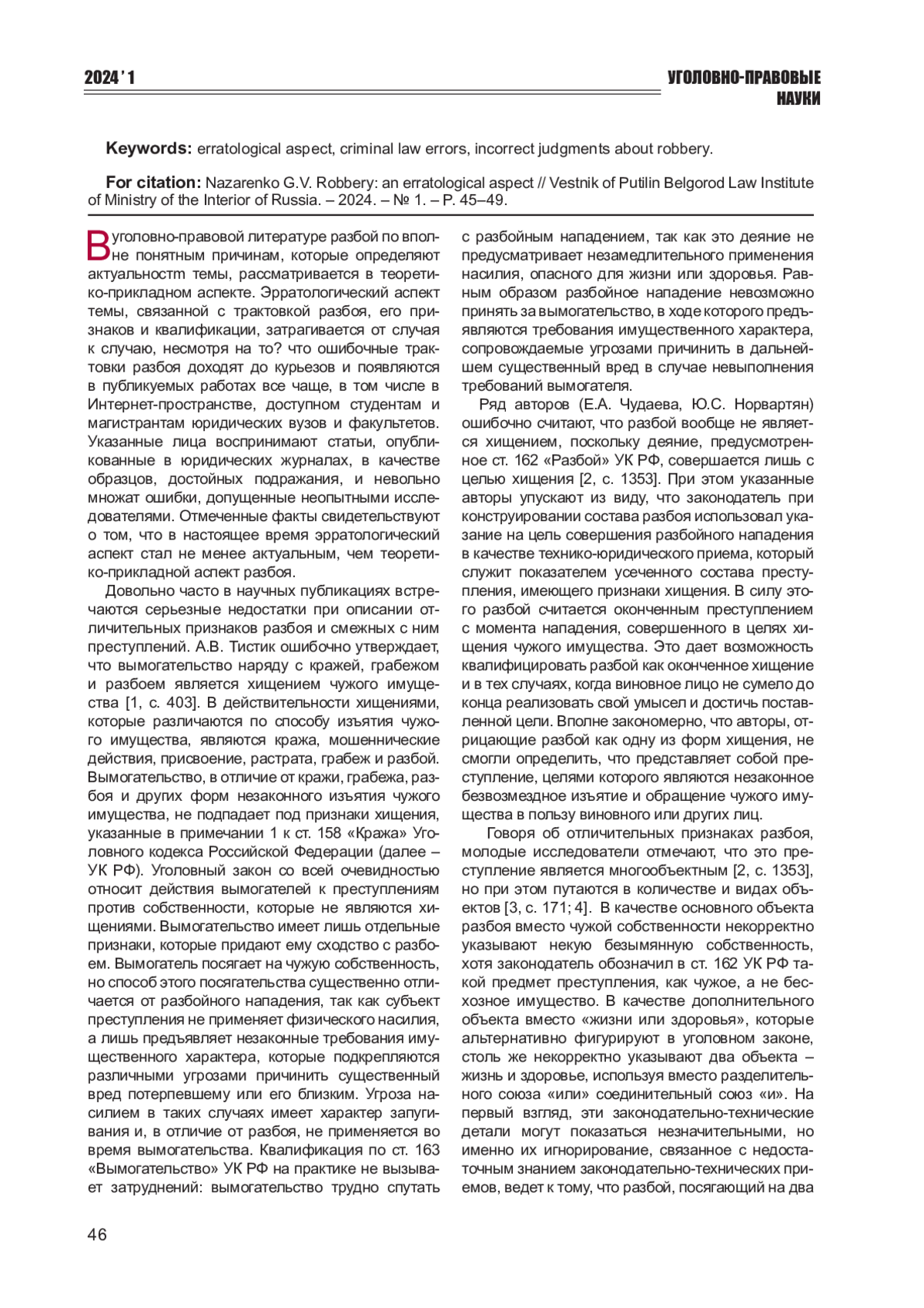 1. Тистик А.В. Проблемы квалификации и отграничения разбоя от смежных составов // Научно-образовательный журнал для студентов и преподавателей. - 2020. - № 2. - С. 402-406.