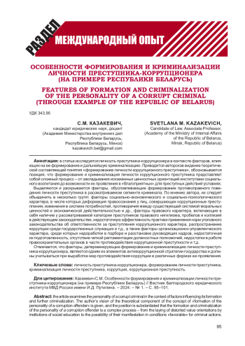 В статье исследуется личность преступника-коррупционера в контексте факторов, влияющих на ее формирование и дальнейшую криминализацию. Приводится авторское видение теоретической составляющей понятия «формирование личности коррупционного преступника», обосновывается позиция, что формирование и криминализация личности коррупционного преступника представляет собой сложный процесс - от закладывания искаженных ценностных ориентаций институтами социального воспитания до возможности их проявления в «благоприятных» для преступных действий условиях.
