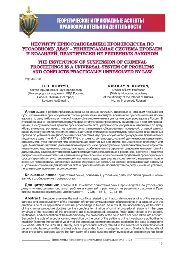12. Ковтун Н.Н., Ростов Д.В. Институт приостановления производства по уголовному делу: о новом “вине” и старых “мехах” // Российская юстиция. - 2023. - № 4. - С. 12-21. EDN: DWOCWU