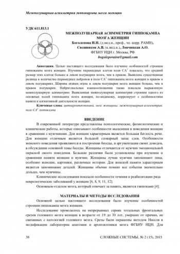 Целью настоящего исследования было изучение особенностей строения гиппокампа мозга женщин. Изучение пирамидных клеток поля СА1 показало, что средний размер этих клеток больше в левом полушарии мозга, чем в правом. Выявлена существенная разница в количестве пирамидных нейронов в поле СА1 гиппокампа мозга женщин в правом и левом полушариях. Ширина stratum oriens в левом полушарии мозга женщин больше, чем в правом полушарии. Нейроглиальные взаимоотношения также показали выраженную межполушарную асимметрию. Выявленная межполушарная асимметрия строения одного из основных полей гиппокампа мозга женщин, по-видимому, коррелирует с особенностями памяти и когнитивной деятельности женщин.