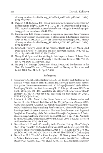4. Городилова Н. И. Рассказ Л. Н. Толстого “Свечка”: от замысла к художественному воплощению // Проблемы исторической поэтики. 2023. Т. 21. № 4. С. 155-177 [Электронный ресурс]. URL: https://poetica.pro/files/redaktor_pdf/1700745924.pdf (10.11.2024). 10.15393/j9.art.2023.13063. (b). DOI: 10.15393/j9.art.2023.13063.b EDN: HRJWXQ