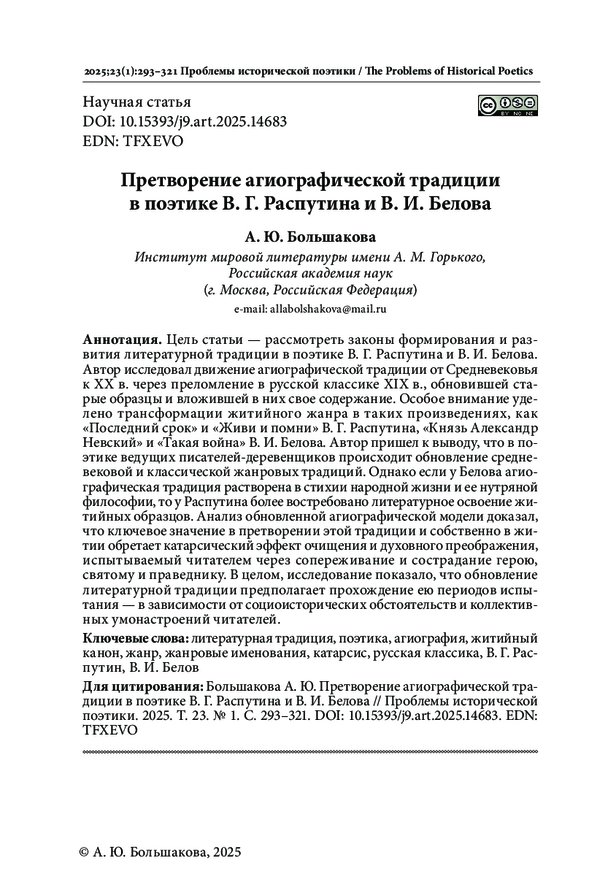 Цель статьи - рассмотреть законы формирования и развития литературной традиции в поэтике В. Г. Распутина и В. И. Белова. Автор исследовал движение агиографической традиции от Средневековья к ХХ в. через преломление в русской классике XIX в., обновившей старые образцы и вложившей в них свое содержание. Особое внимание уделено трансформации житийного жанра в таких произведениях, как «Последний срок» и «Живи и помни» В. Г. Распутина, «Князь Александр Невский» и «Такая война» В. И. Белова. Автор пришел к выводу, что в поэтике ведущих писателей-деревенщиков происходит обновление средневековой и классической жанровых традиций. Однако если у Белова агиографическая традиция растворена в стихии народной жизни и ее нутряной философии, то у Распутина более востребовано литературное освоение житийных образцов. Анализ обновленной агиографической модели доказал, что ключевое значение в претворении этой традиции и собственно в житии обретает катарсический эффект очищения и духовного преображения, испытываемый читателем через сопереживание и сострадание герою, святому и праведнику. В целом, исследование показало, что обновление литературной традиции предполагает прохождение ею периодов испытания - в зависимости от социоисторических обстоятельств и коллективных умонастроений читателей.