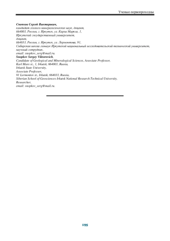 12. Снопков С.В., Хобта А.В., Богданова И.А., Швалева Н.И. Вклад геологов ИГУ в изучение Ботогольского графитового месторождения (Восточные Саяны) // Геология и окружающая среда. 2024. Т. 4, №. 4. С. 37-57.